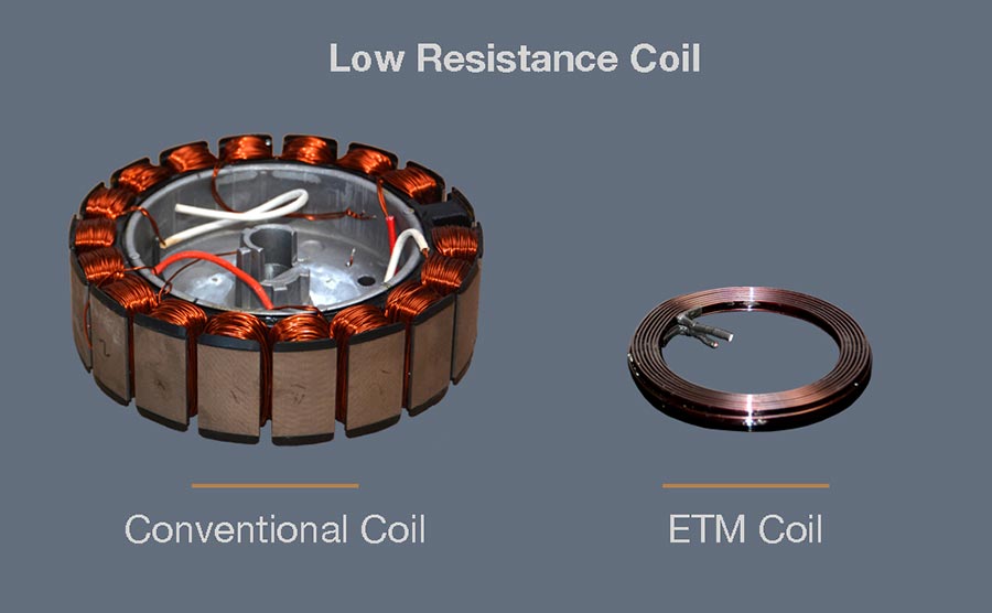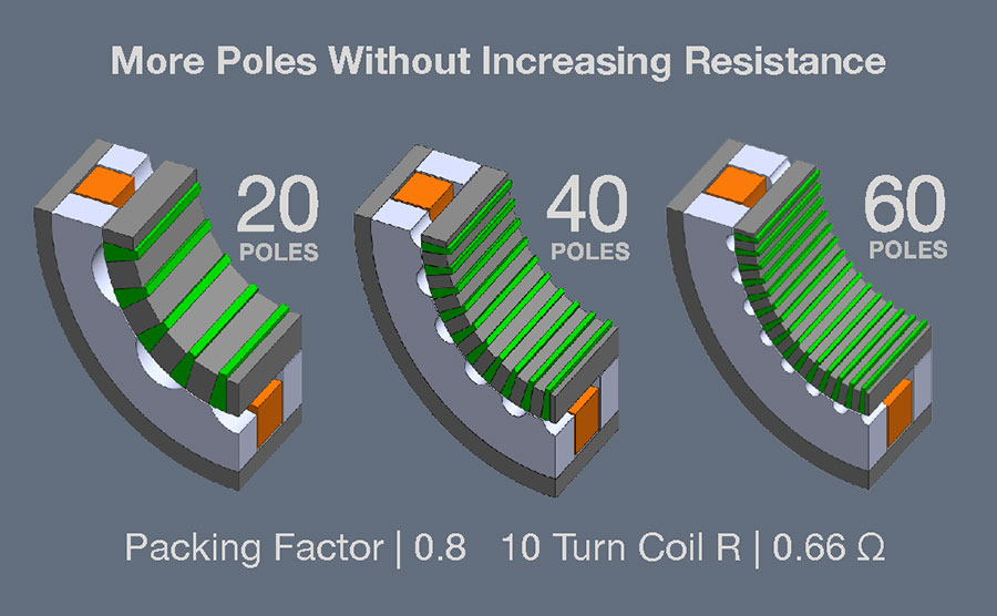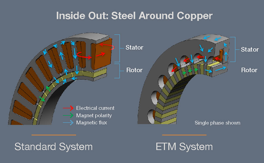 ETM optimizes torque by increasing the number of electromagnetic poles; we’ve literally decoupled the relationship between pole count (torque) and resistance (losses).