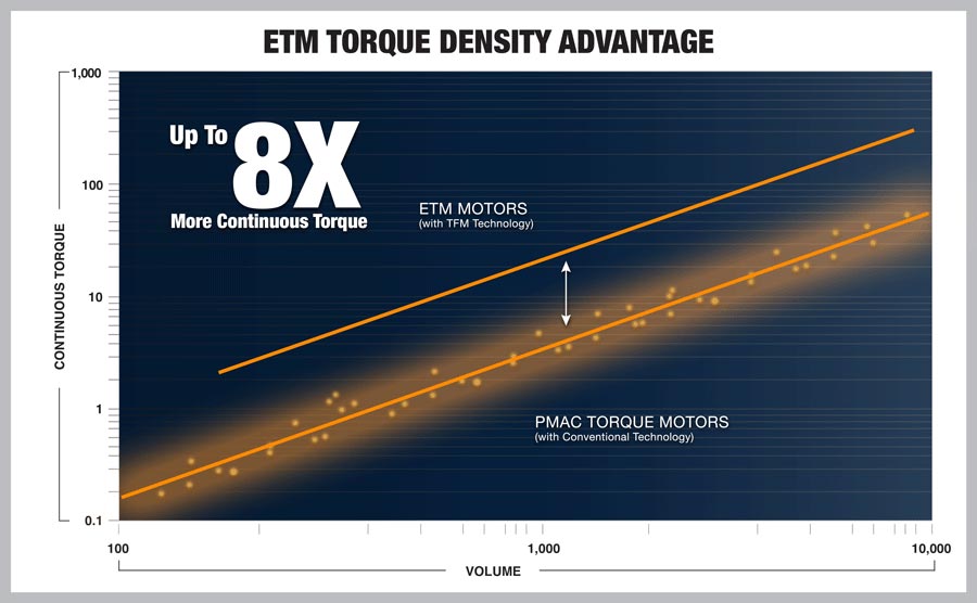 ETM Transverse Flux Motors provide up to 8X more continuous torque at low speeds than conventional motors. ETM technology increases torque and power density while minimizing size and resistance losses.
